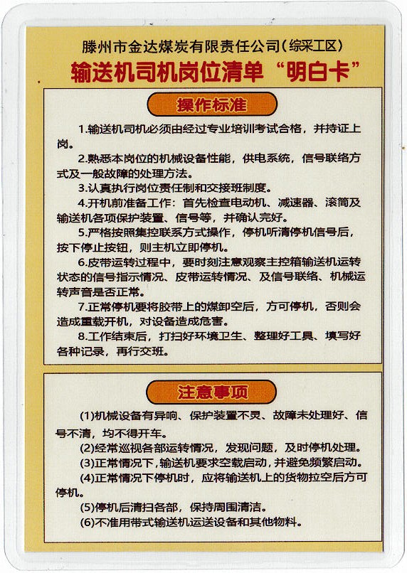 自國(guó)家礦山安監(jiān)局推廣使用安全生產(chǎn)崗位“明白卡”以來,企業(yè)高度重視,組織人員按照井上下所有的工作崗位精心制作了安全生產(chǎn)崗位“明白卡”。既美觀又便于職工隨身攜帶,讓職工按“卡”規(guī)范作業(yè),深受廣大職工的喜愛。